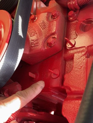 2、東風(fēng)多利卡D9灑水車(chē),配康明斯230馬力發(fā)動(dòng)機(jī),發(fā)動(dòng)機(jī)缸體號(hào),在發(fā)動(dòng)機(jī)的前方,主駕駛座椅下面的位置,找到皮帶輪,靠近身體一側(cè)的皮帶輪旁邊有兩個(gè)塑料,像以前老式電視機(jī)調(diào)頻道的開(kāi)關(guān)一樣的配件,這兩個(gè)配件,上下在一條直線(xiàn)上,這兩個(gè)配件中間就是缸體號(hào)。
