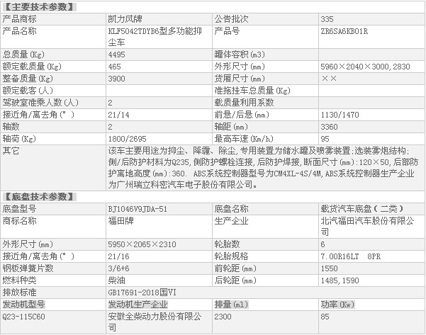 底盤配置:福田時代領航H2抑塵車專用底盤,國六標準排放,1850mm寬駕駛室、單排前翻、全柴115馬力發動機,5檔變速箱、7.00R16鋼絲胎、動轉、ABS、可調方向盤、電控熄火、氣剎、巡航、排氣制動、可調大燈、剎車自調臂。